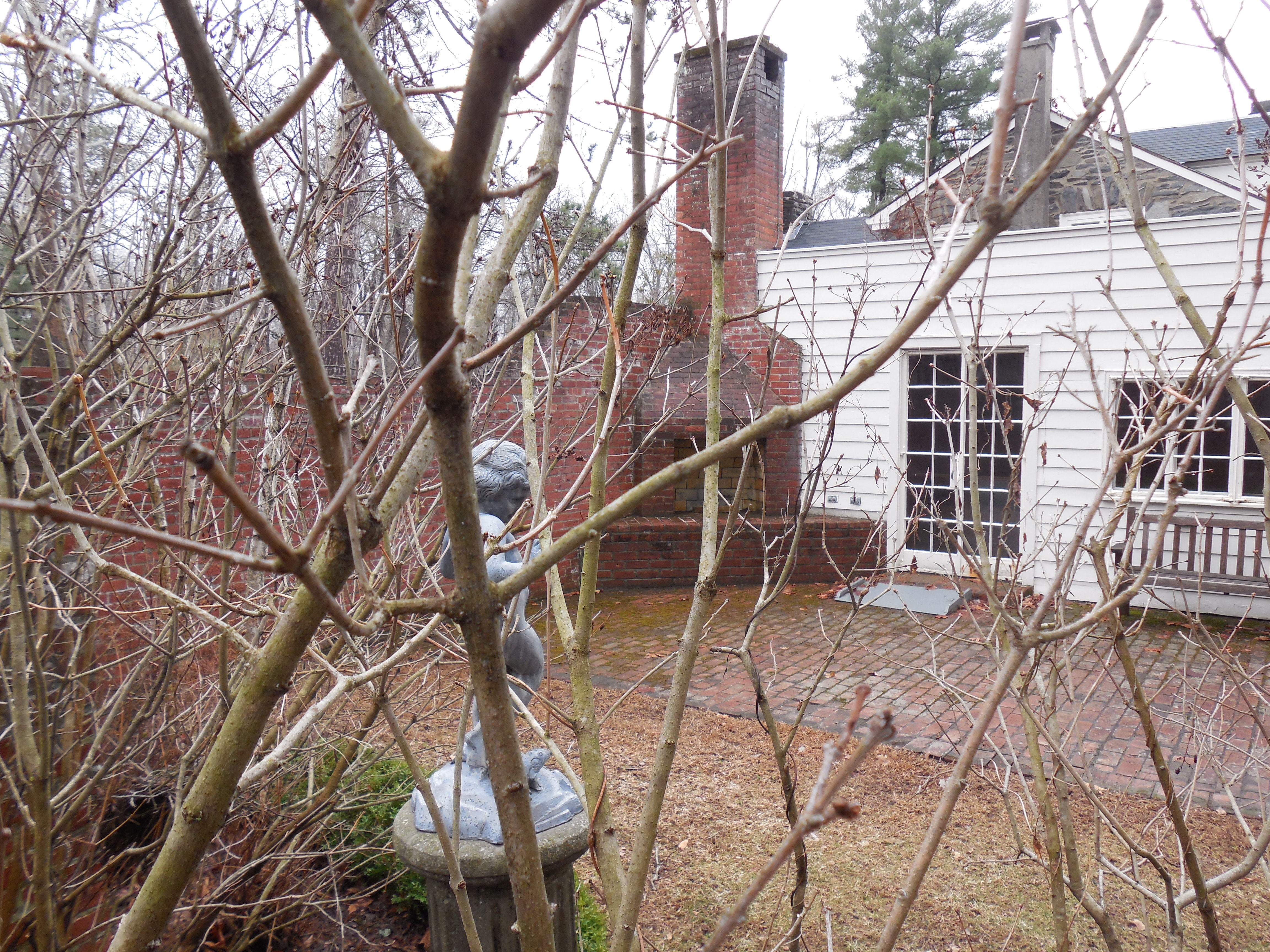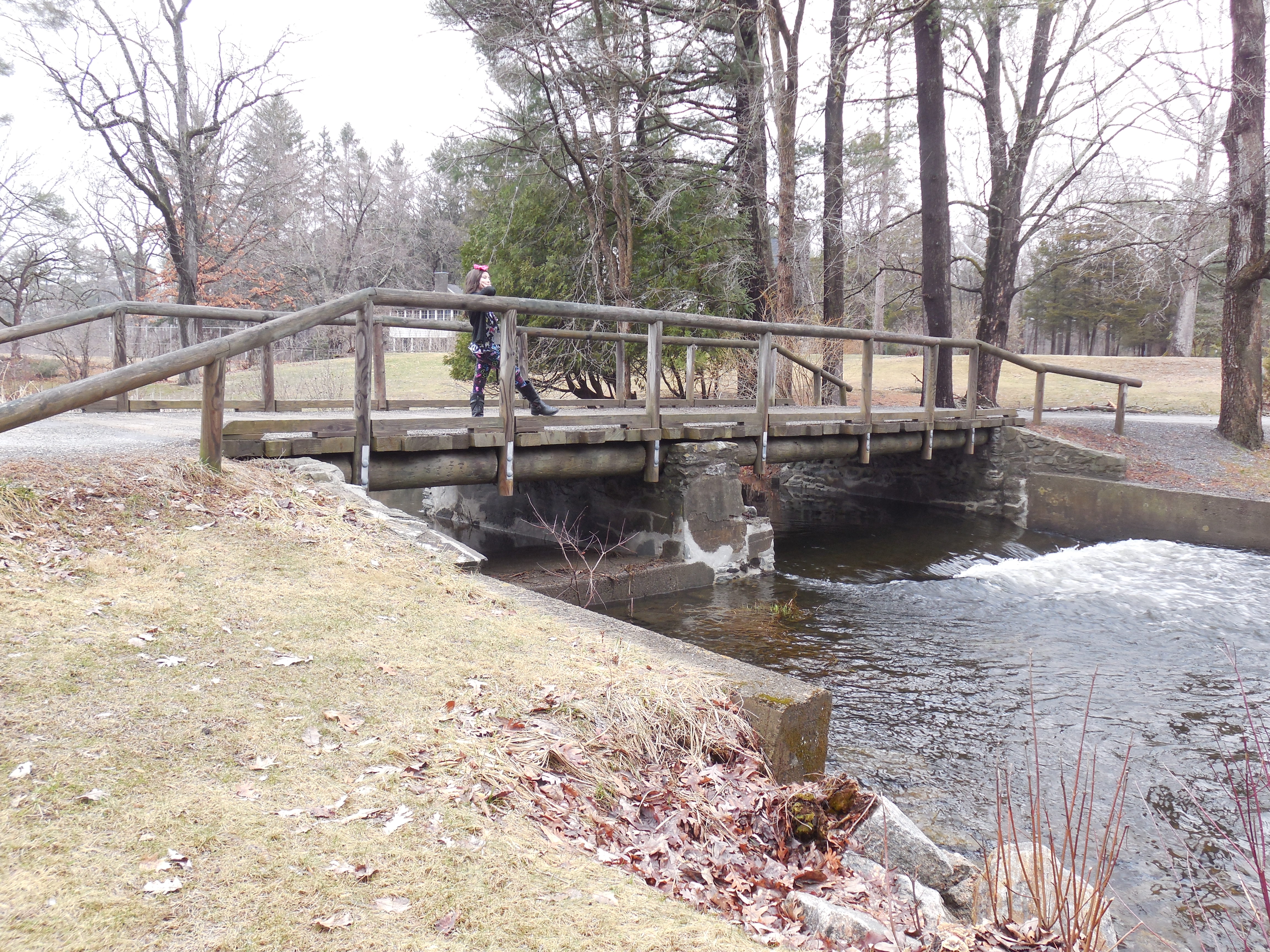 We wandered down the path (1, 2) and over the wooden bridge (3) taking photos along the way. There was a little door in the side of the hill with rock walls as tall as my daughter bordering it. (4) We took some more photos and she stood on top of the wooden deck slats.(5) She peeked between the slats and said that it was deep and empty. We walked around the cottage and down into what I presumed would be a very pretty fenced garden come summer time. (6) There was an outdoor fireplace. Coming around the back of the stone cottage there was a white wooden fence surrounding a courtyard with another outdoor fireplace and a cherub statue that might be a fountain when it’s not so cold as to freeze. (7, 8, 9)