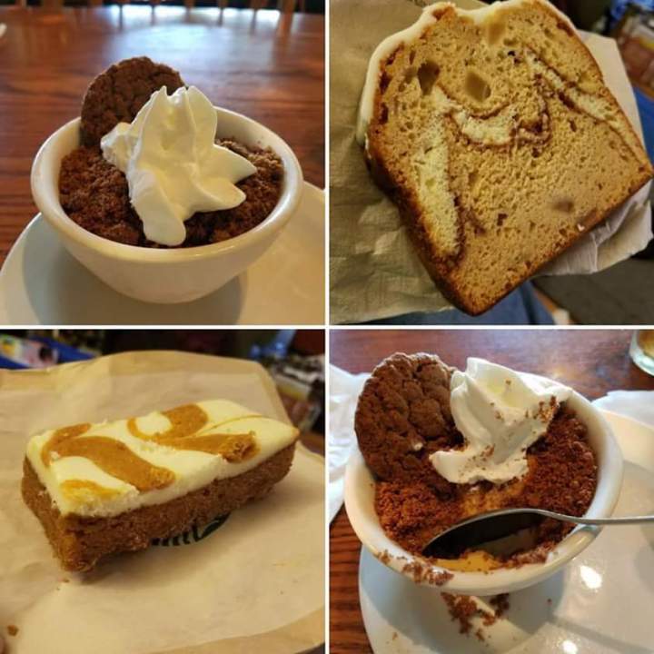 Fall Foods Standard Fall Foods: Pumpkin custard with cookie crumbles and a ginger snap cookie from Cracker Barrel. Apple Pound Cake and Pumpkin Cheesecake Bar from Starbucks. (c)2017
