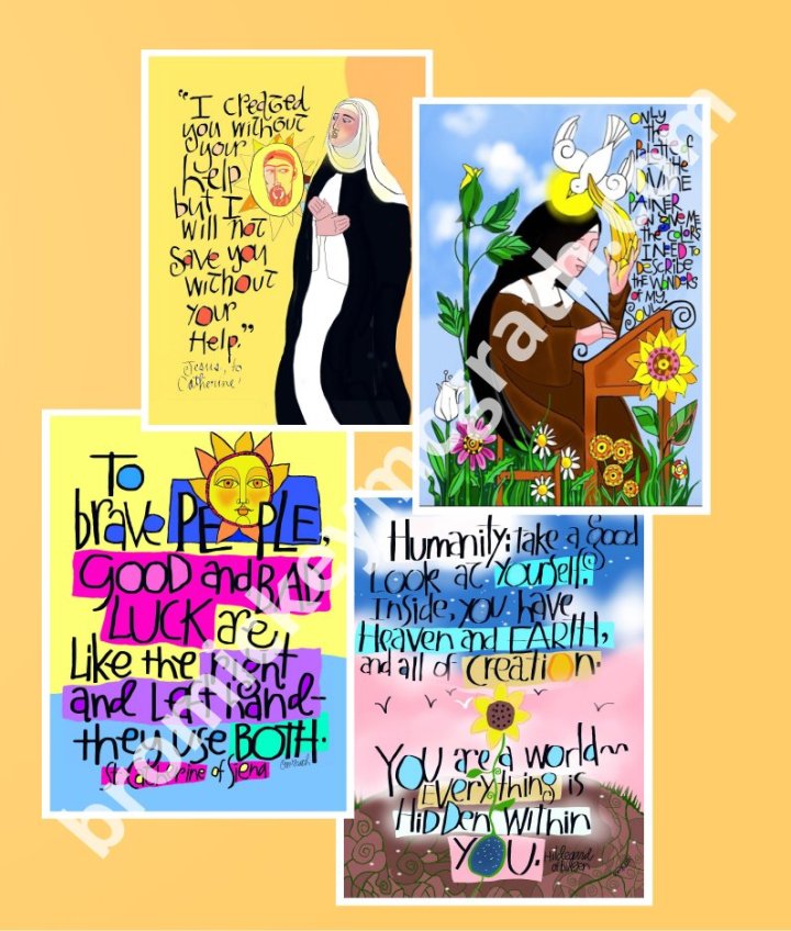 One of his new products is a card set called Prayer Starters. Below the cut, you will be able to click on the picture to be taken to his website to purchase them if you are interested in that. Simply, they are a set of about thirty cards with an easel under the theme of Wise and Holy Women featuring the words of the four women Doctors of the Church, Sts. Hildegard of Bingen, Catherine of Siena, Theresa of Avila, and Therese Lisieux plus Dorothy Day and Sister Thea Bowman combined with Brother Mickey’s beautiful art.
