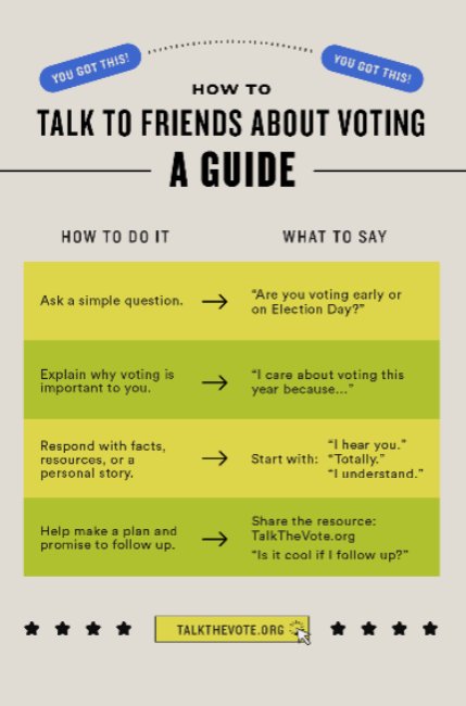 Election Connection: 6 Days Standard In addition to yesterday’s post, here is another resource to get out the vote! Click to follow the link with some great tools for talking to and encouraging your friends, relatives, and neighbors to vote! TALKTHEVOTE.ORG (c)2020 Share this: Click to share on X (Opens in new window) X Click to share on Facebook (Opens in new window) Facebook Like Loading... Related