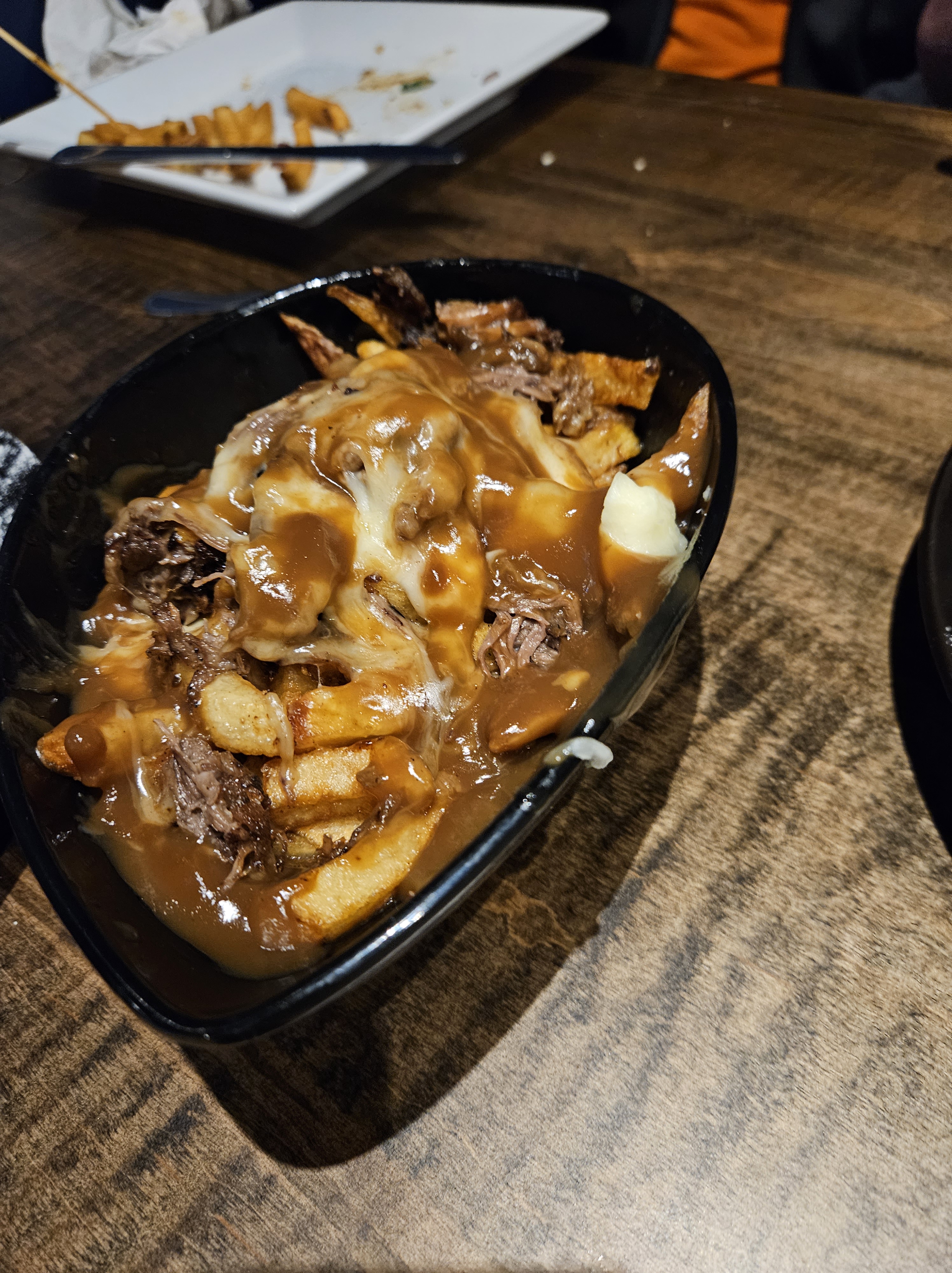 Fries with gravy and Deception Sauce. The deception sauce starts out sweet and then brings the heat.