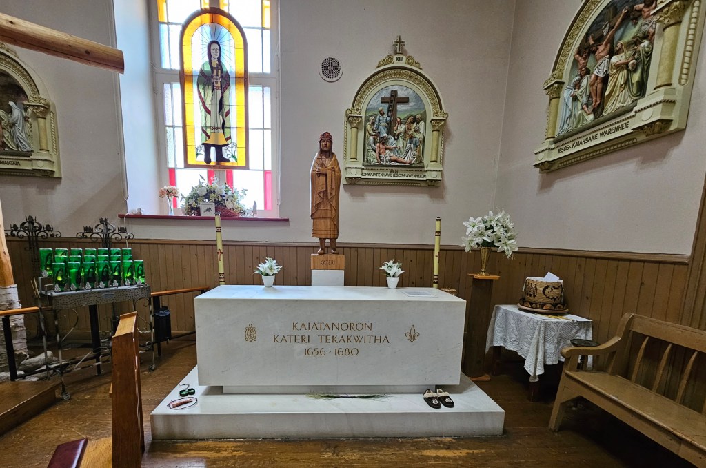 This mission church is a permanent building and was erected in 1716. Before that it was a moveable mission that traveled with the Mohawks beginning in La-Prairie-de-la-Madeleine. They moved a total of five times each time their mission church was constructed the same as the other Mohawk buildings until this last time in its permanent location. St. Kateri’s remains were entombed here in 1972.