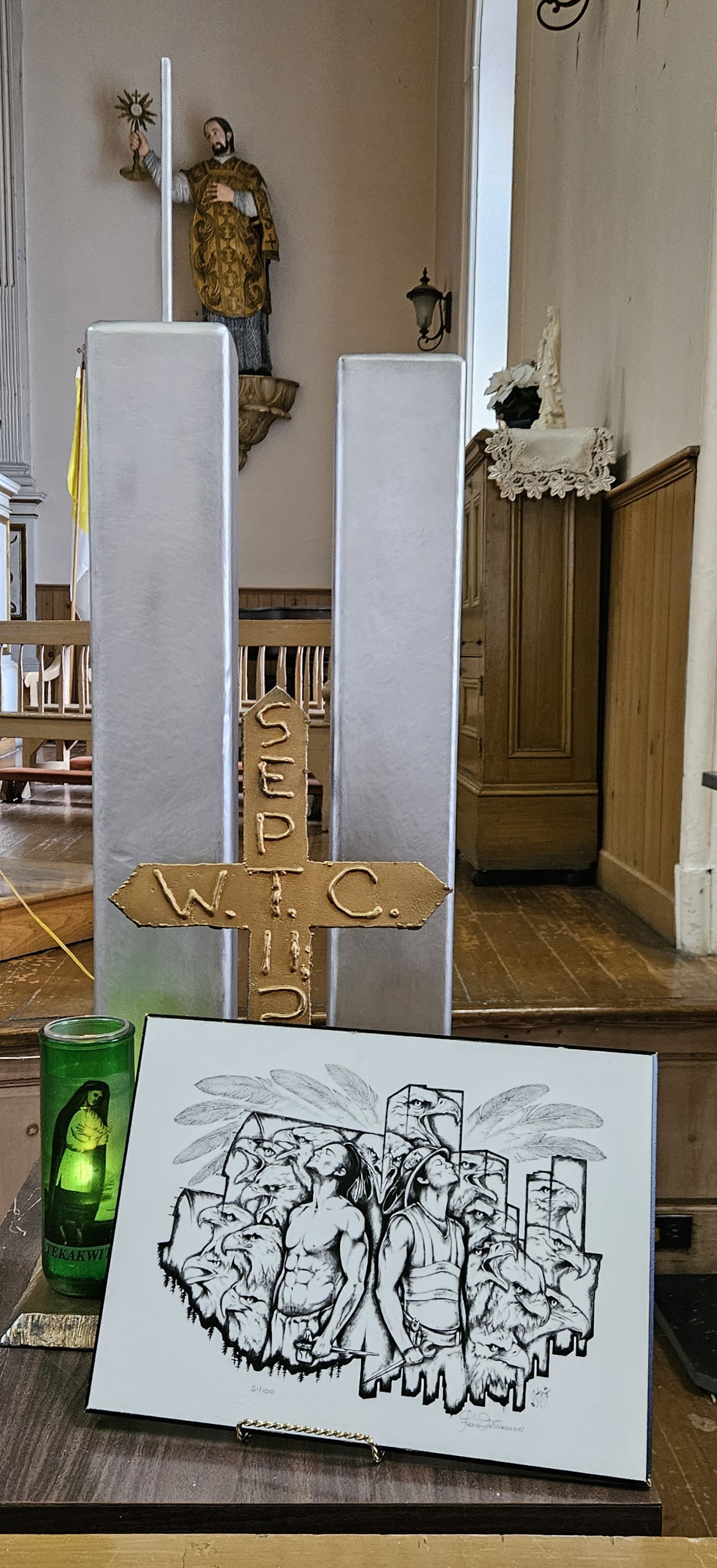 Inside the church, in addition to St. Kateri’s tomb, are two memorials: the first is to the Mohawk men lost in the Quebec Bridge disaster in 1907, and the second is an ironwork replica of the World Trade Center’s Twin Towers in honor of 9/11. Both are on the main altar. It should be noted that the Mohawk are known for their ironworking skills, and were large parts of crews building not only the World Trade Center, but the Empire State Building as well in addition to many other high-rise buildings and skyscrapers across the area.