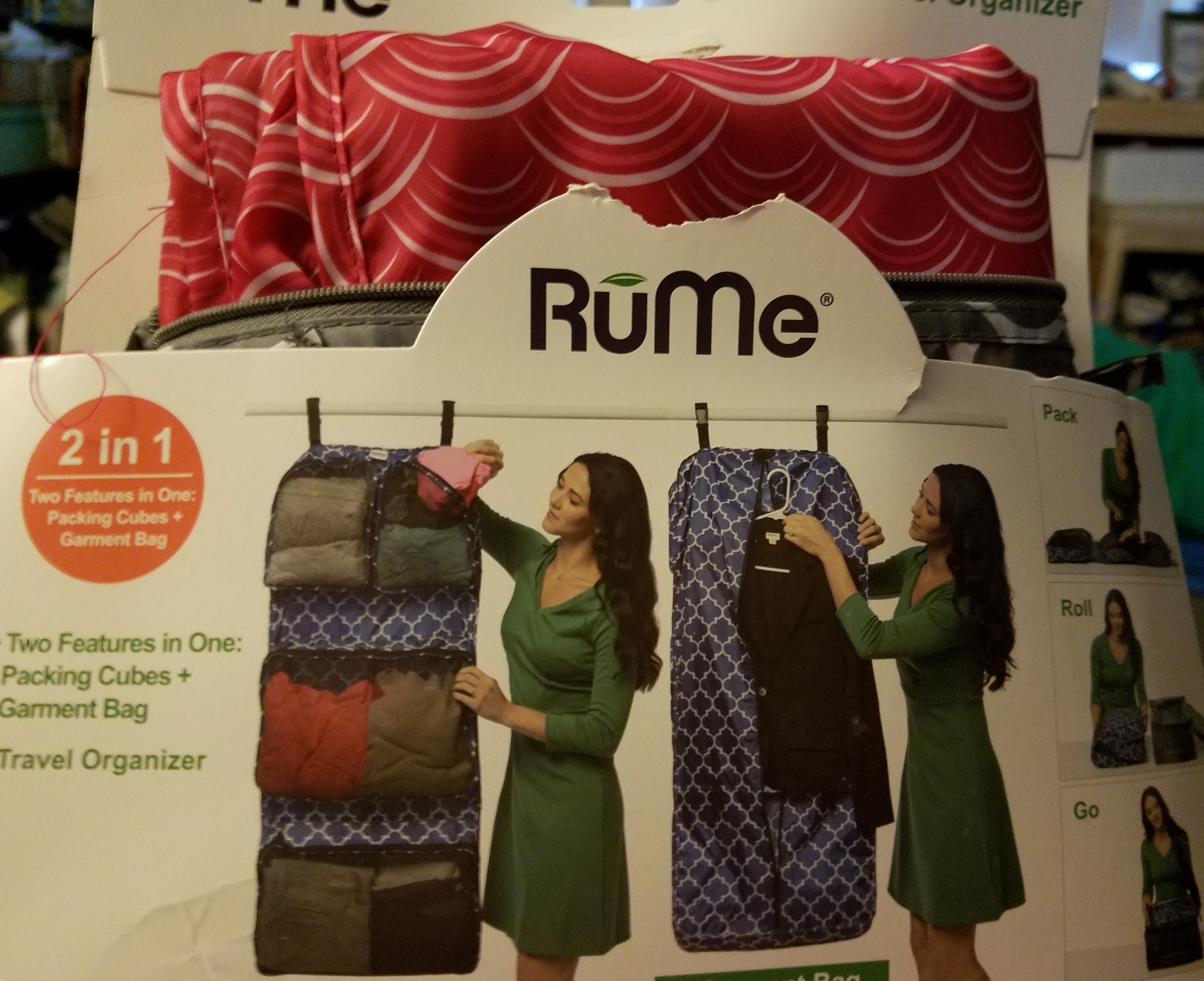 One item that I’ve been using forever is a RuMe garment travel organizer. To be honest, I almost never hang anything in the garment bag section, and only use the other side. It has two large see-through mesh pockets and two smaller see-through mesh pockets. It folds up into threes and closes with two quick-release adjustable buckles. It fits perfectly in a carry-on suitcase. When you get to your destination, release the buckles and hang it on the closet rod using the same adjustable buckles.