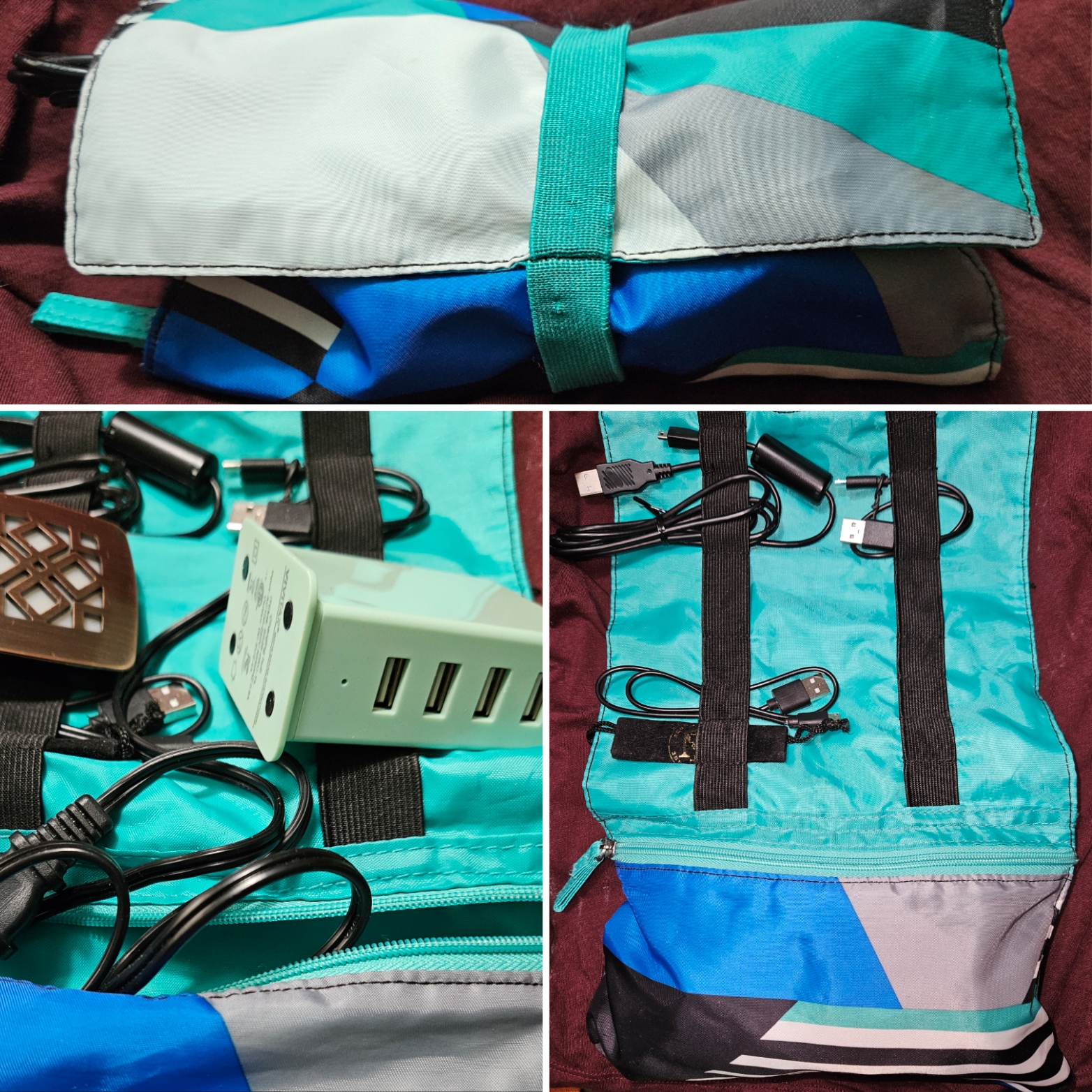 The second item I never leave home without is a roll-up charger carrier. It has elastic bands to hold wires and USB cords and a pocket for the plugs/adapters (and for me, a multi socket charging adapter and a nightlight). The one I have rolls right up and closes with an elastic band.