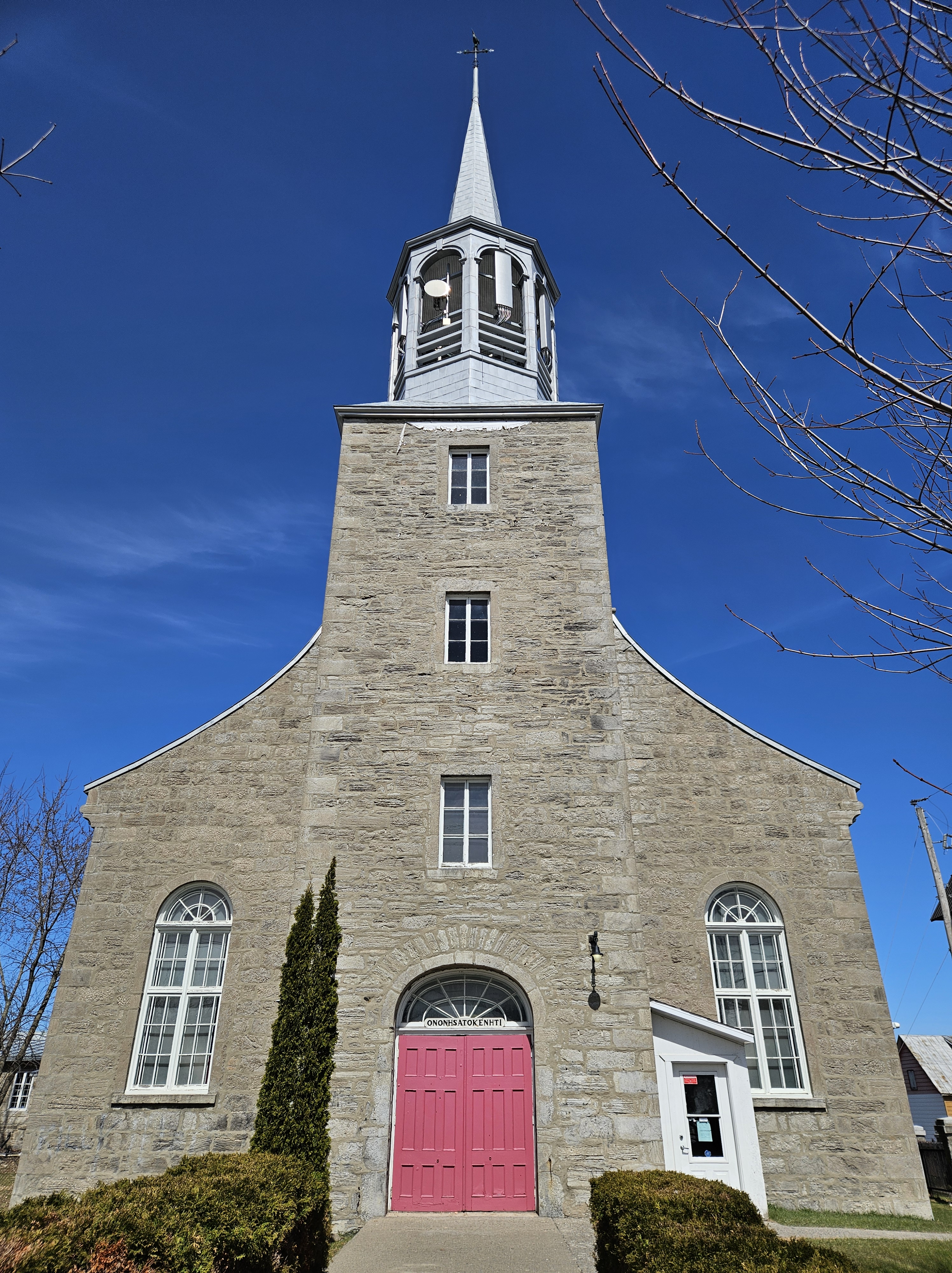 While the Mohawk Catholics were devoted to their church and their Saint, others in the Mohawk nation and on the reserve are not as supportive about the situation of the church. This has been the case throughout their history, but in recent years with the discovery of mass graves in Kamloops, British Columbia at the Indian residential schools, it has become more of a minefield to dodge. The mission church has had instances of graffiti on the front stone walls and on the red, wooden door. There have been protests. When we visited during the covid pandemic in 2021, there were hundreds of shoes laid out in front of the church gate to represent the 215 children found in Kamloops. There is still a sign on the adjacent telephone pole with the number 215 on it. There are also signs throughout Kahnawake that depict an orange hand with ‘every child matters’ written. There are orange handprints across the stone wall that borders the Seaway behind the church. I hadn’t noticed it right away, but while I was taking a photo of the back of the church for a text to my godmother, I saw that someone had spray painted “genocide” on the roof.
