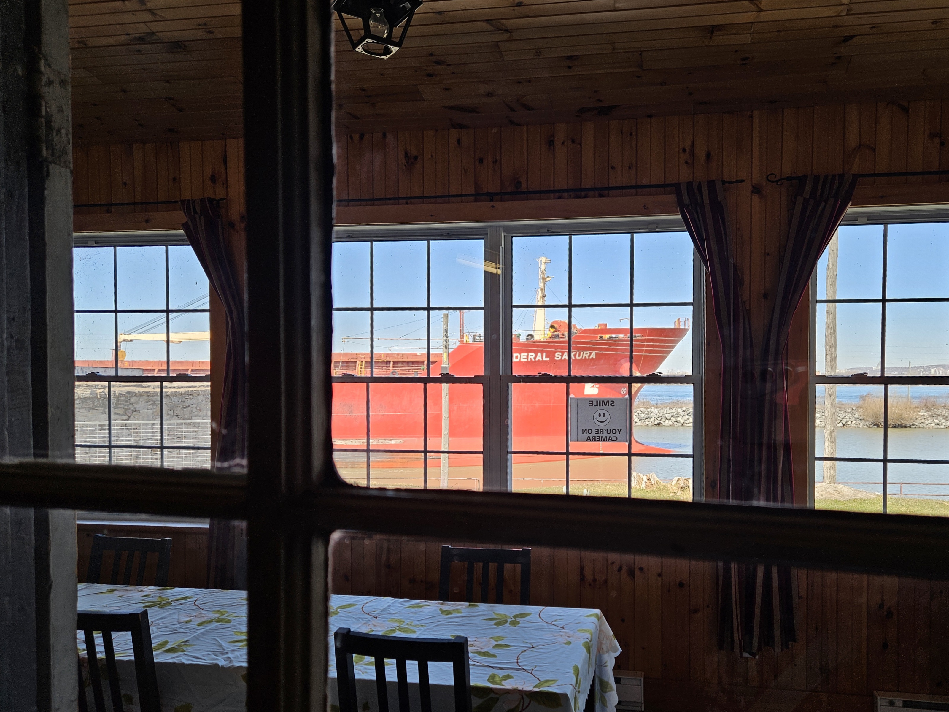 While my son and I were looking through the exhibit, he suddenly pointed out the window and the bow of a huge ship was sailing slowly past. It seemed close enough to reach out and touch it. It filled the entirety of the four-paned window. That was unexpected.