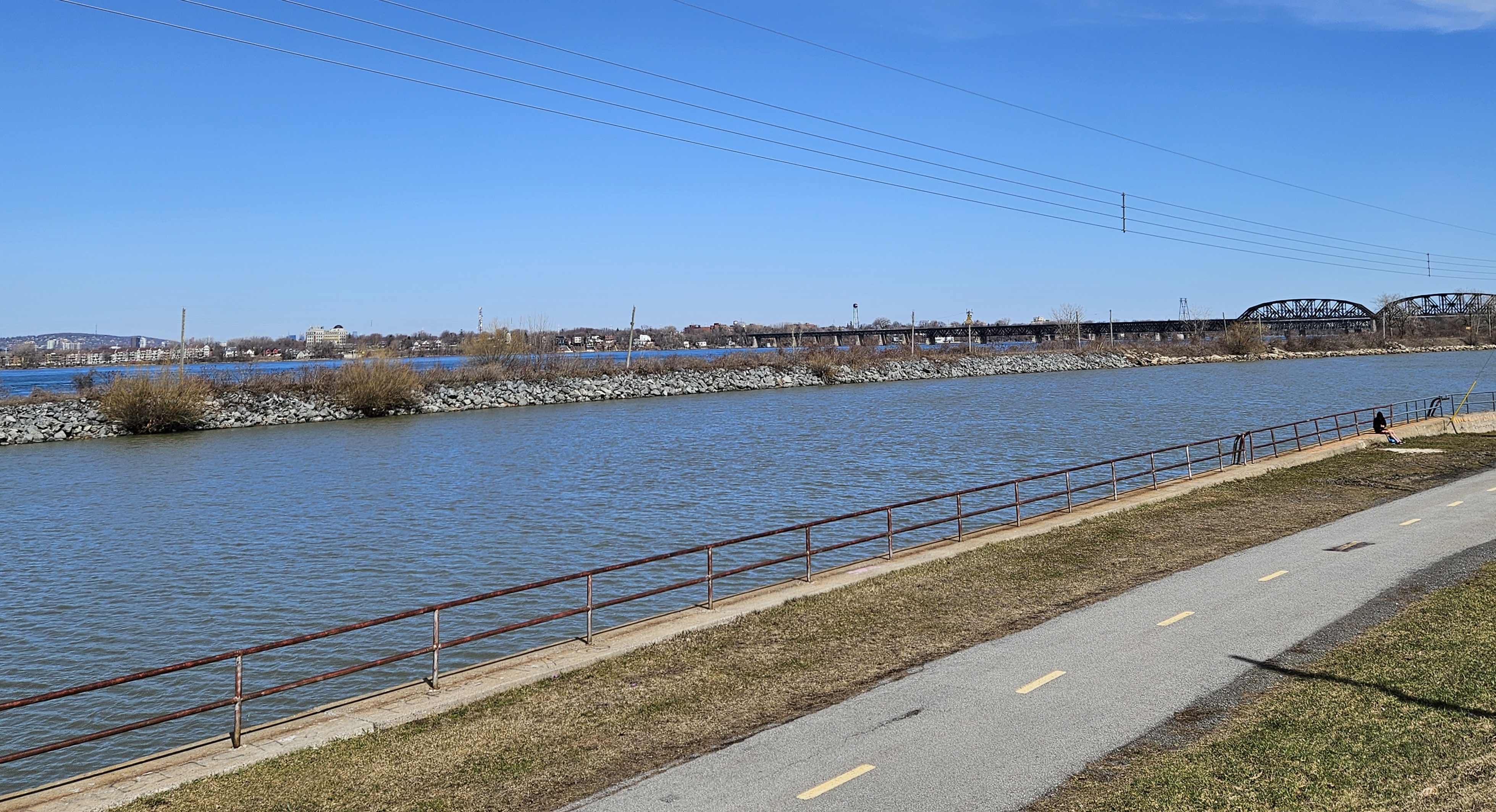 When the staff mentioned the eclipse, I asked if we could stay out back, and they were just lovely about it. I was happy. There were several parking spaces across from the church and on the side between the church and the Kahnawake welcome center. I kept thinking that many more people would be there on the back lawn of the church as it got closer to eclipse time. The back of the church faces the St. Lawrence Seaway, and from there we could see some of Montreal including the St. Joseph Oratory, which is located on what we were told is a “sleeping volcano.” The Honore Mercier Bridge that spans the St. Lawrence River from Montreal to the Kahnawake Reserve can also be seen.