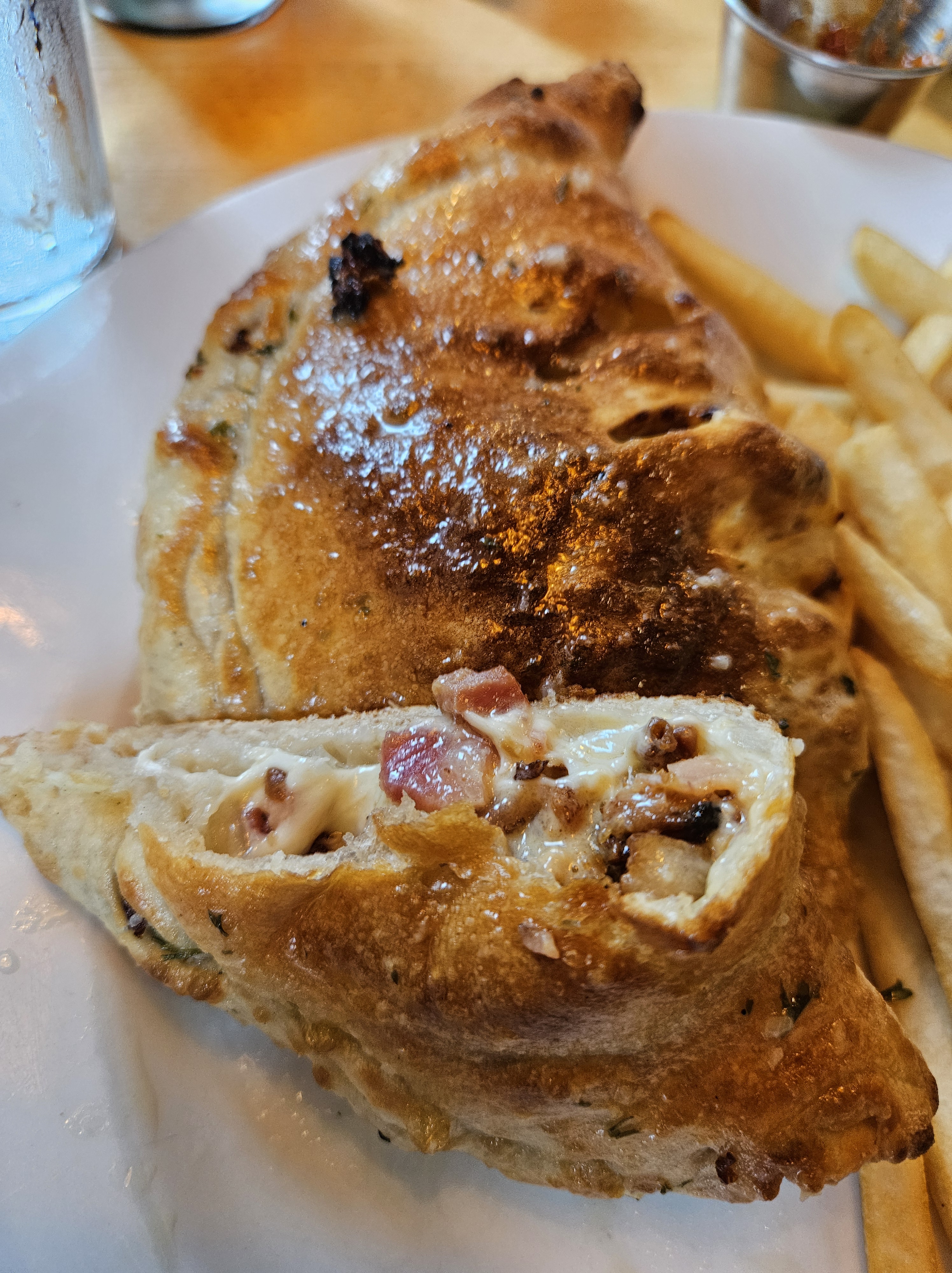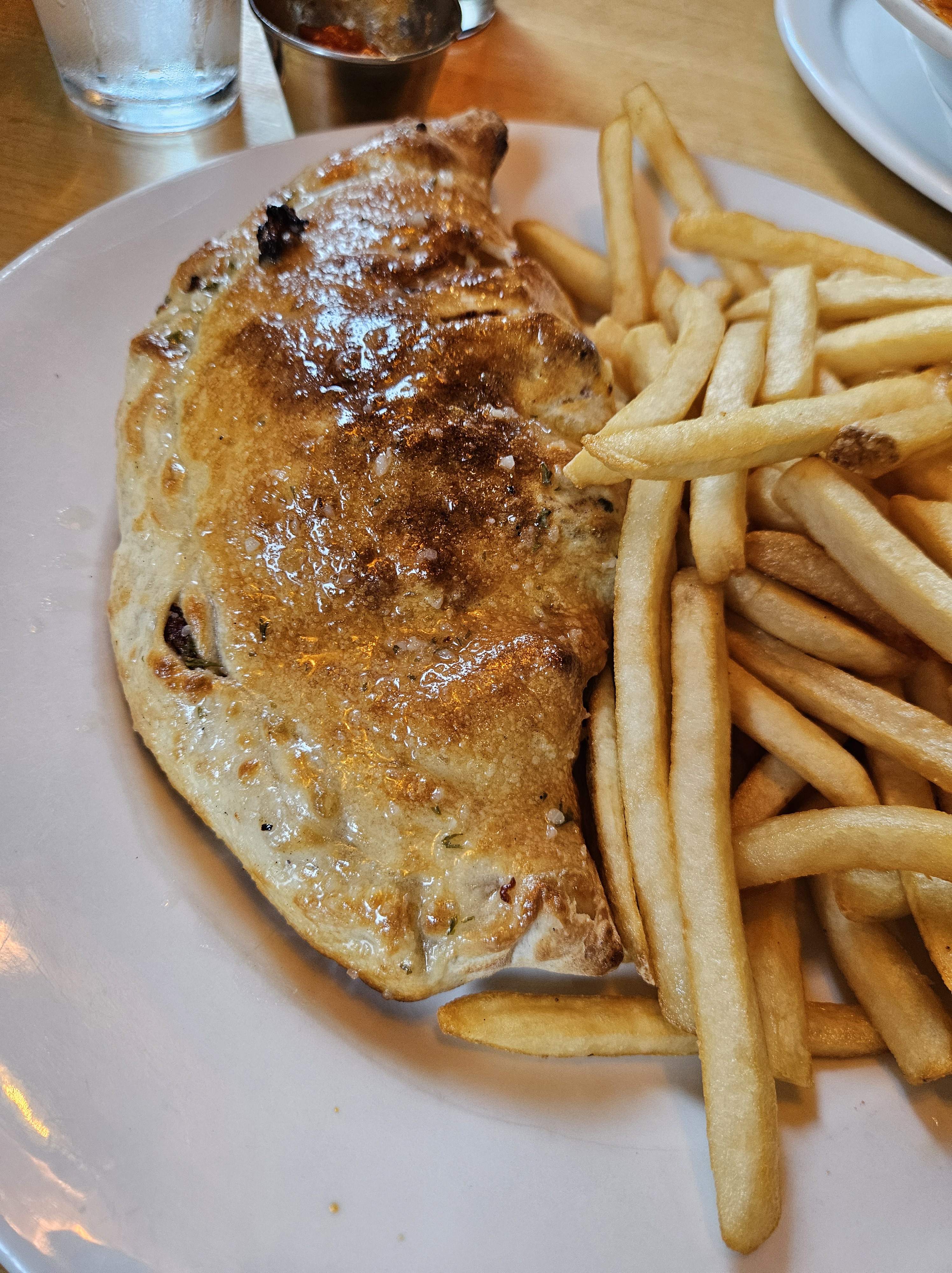 Panzerotti with fries. These fries are what McDonald’s fries should taste like. They describe this as a folded pizza – I’d call it more of a calzone without the ricotta cheese. At Toujours Mike’s in Delson. (c)2025