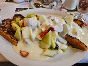 Pain dore aux fruits et creme patissiere at Le Celebrite in Brossard. (French toast with fruit and custard – mouthwatering delicious!) (c)2025