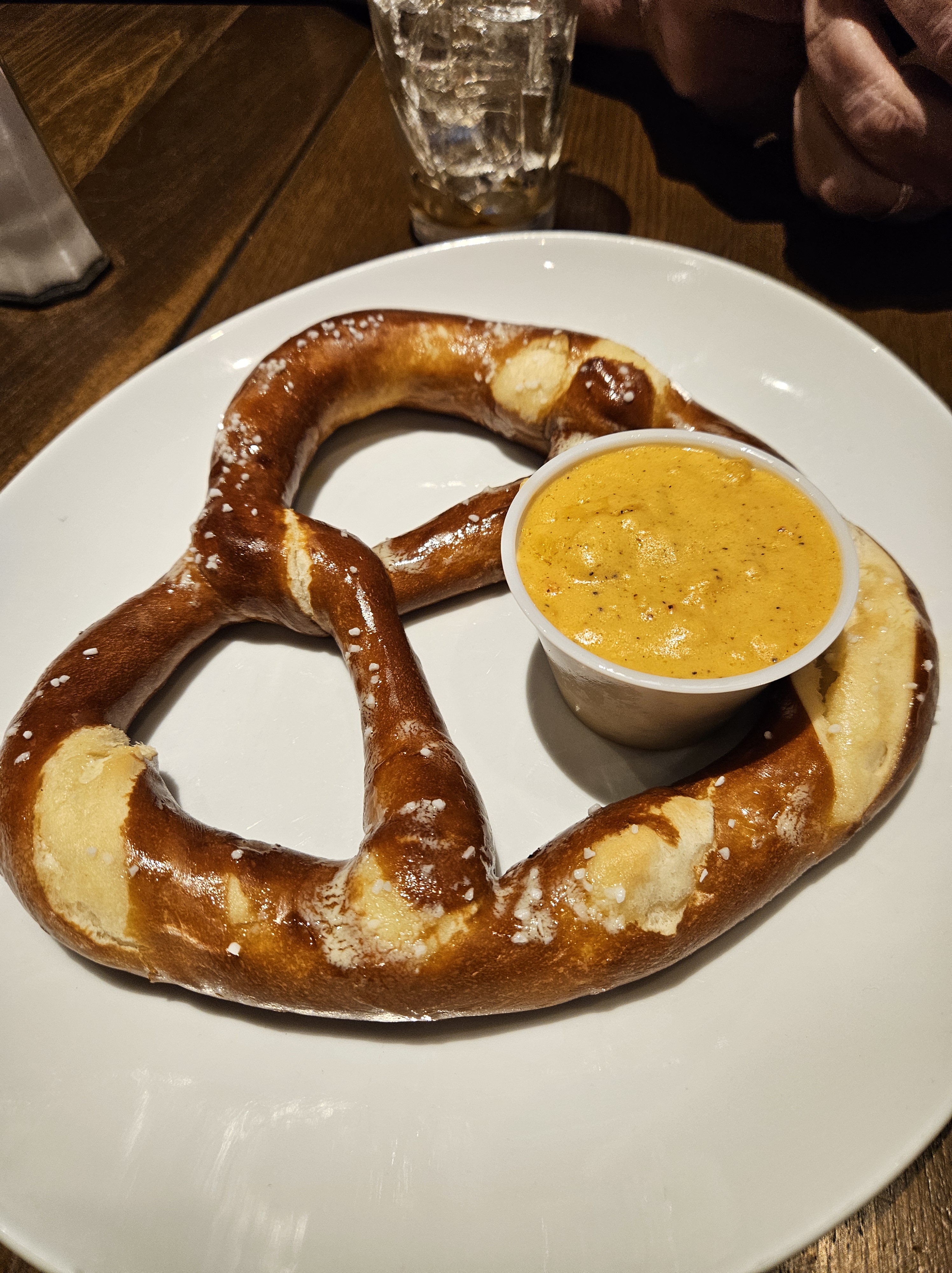 Large soft pretzel with melted cheese. Robbie’s Smokehouse in Kahnawake. (c)2025