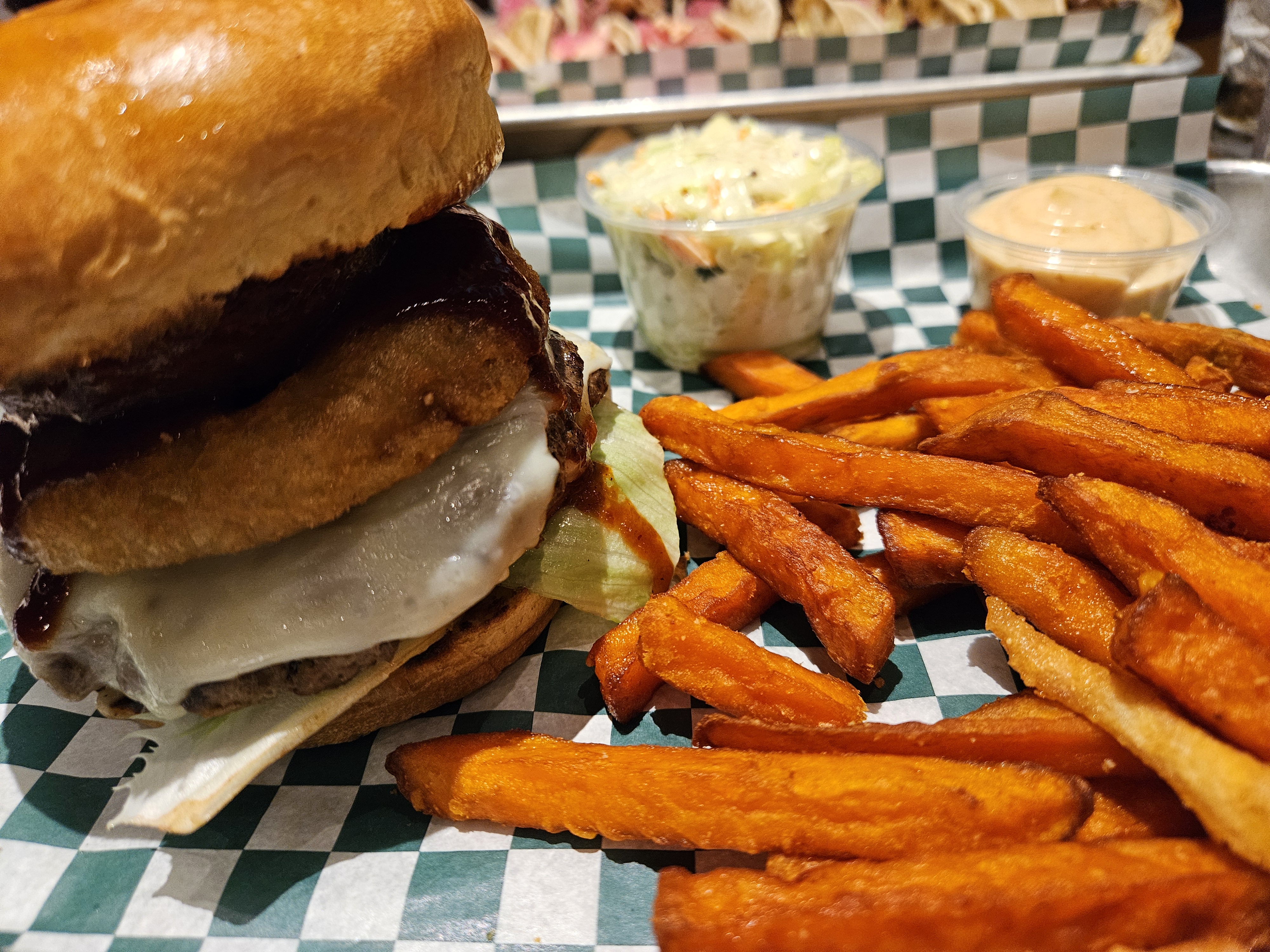 Jacks Burger with sweet potato fries, cole slaw, and spicy mayo. I brought the mayo home for my son, and he loved it. Robbie’s Smokehouse in Kahnawake. (c)2025