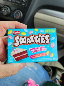 Smarties. Birthday Cake Smarties. My husband found them in Super C. I like the Smarties better than our M&Ms. (c)2025