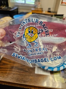 Emtpy bagel bag, but this was my breakfast today at work. It will be again tomorrow. St. Viateur Bagels in Montreal. The varieties we got this time were pretzel salt, rosemary & sea salt, butterscotch & caramel, maple apple, all dressed, and sesame. (c)2025