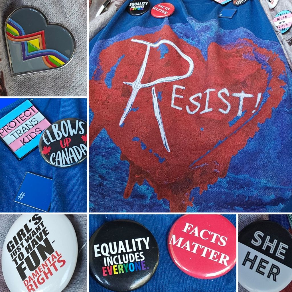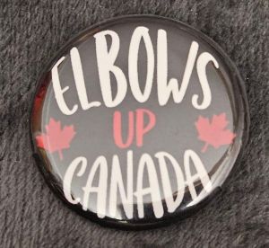 I think I’m dressed as a Canadian. An odd choice. I tried to find a hockey stick, nothing. I have a ROOTS t-shirt with their trademarked beaver and an Elbows Up pin, along with dangly fall leaves earrings that include a maple leaf, pumpkin socks, and my hat.