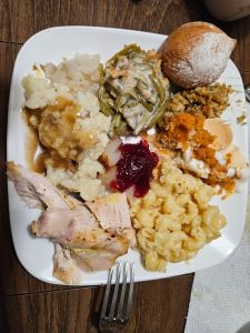 Holiday Dinner: Turkey, of course, mashed potatoes with gravy, green bean casserole, sweet potato pie, macaroni & cheese, cranberry sauce, and a dinner roll.