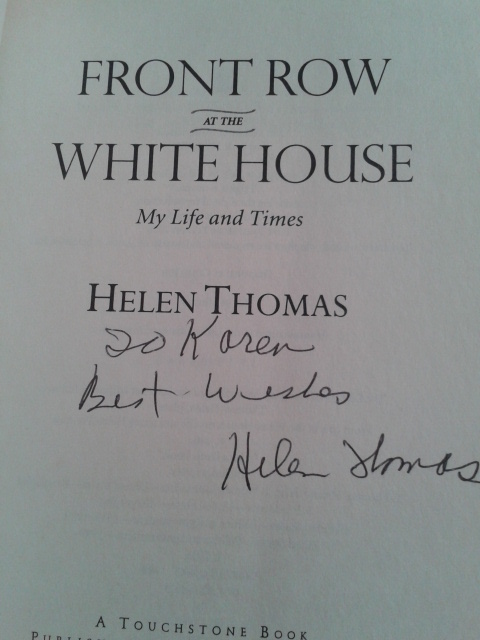 I met Helen Thomas once, in the fall of 2001. She was the guest speaker at a Chamber of Commerce luncheon. I don’t know how I managed to get a ticket, although it was open to the public. I sat next to the city of Albany (our capital) Comptroller. It was very exciting and lunch was actually very good despite those types of things usually not very. The ticket price came with a copy of her book, Front Row at the White House and she would sign it, (but there was no guarantee of that) if you waited in line. At some point, they cut the line off; it was getting late and Ms. Thomas had other places to go, but I believe after waiting quite a while the woman in front of me was supposed to be the last autograph. I wouldn’t leave the line, though. I didn’t create a scene; I just ignored the handlers. For a writer, for me, this was one of those moments that if you walked away you would regret, and I ‘m glad I stuck it out as you can see form the photograph.