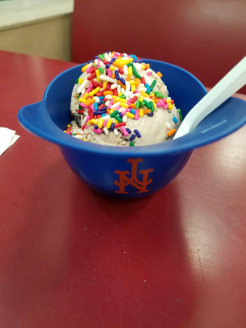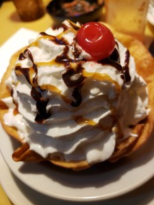 Vanilla ice cream. Chocolate or caramel sauce. Whipped cream. Sprinkles – rainbow or chocolate. And cherries. (Last week there was also strawberries.)