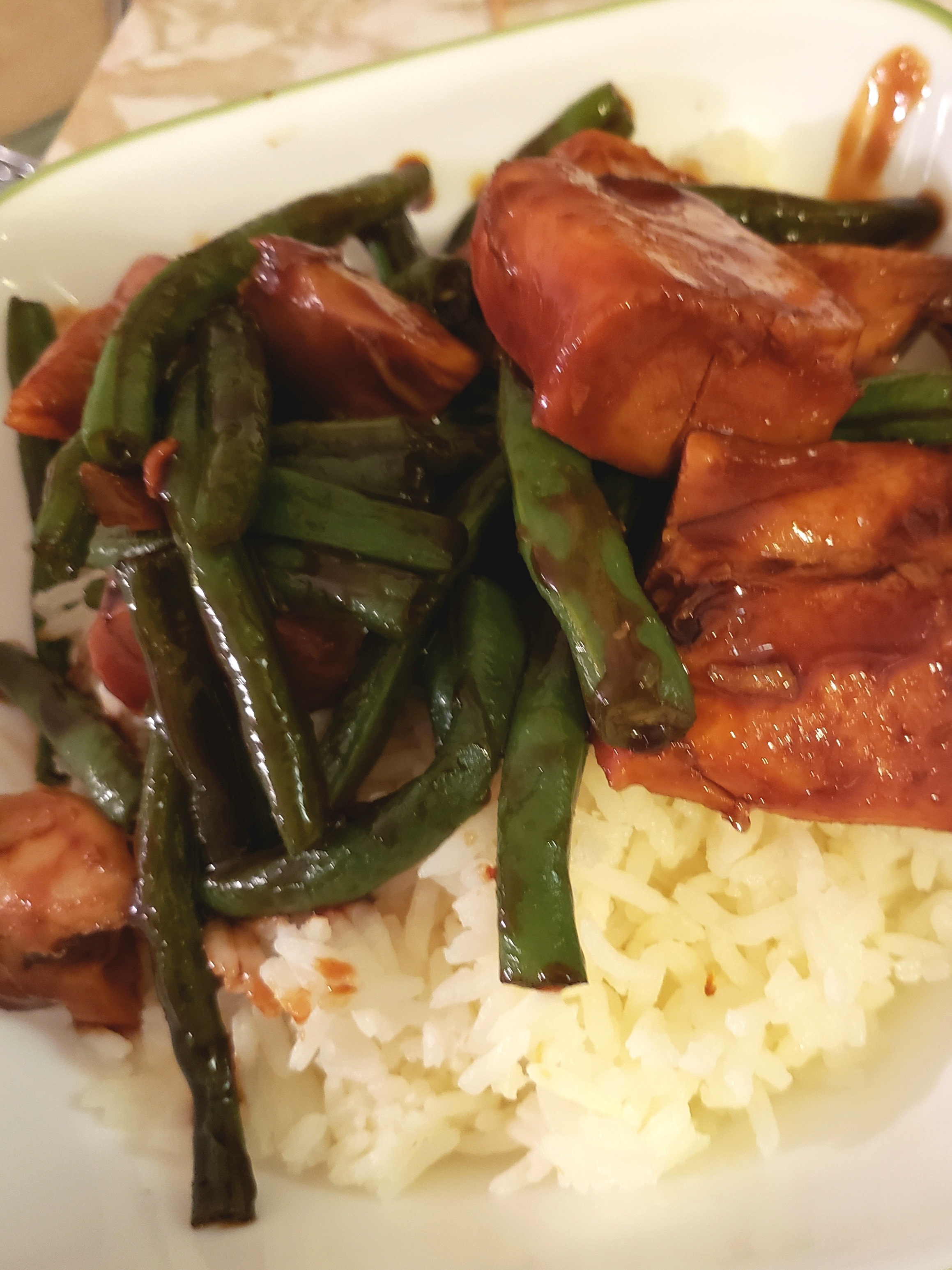 I trimmed the ends off of fresh green beans and broke them in half, and added them to the wok, mixing the chicken and the beans until they were hot and incorporated with the sauce.