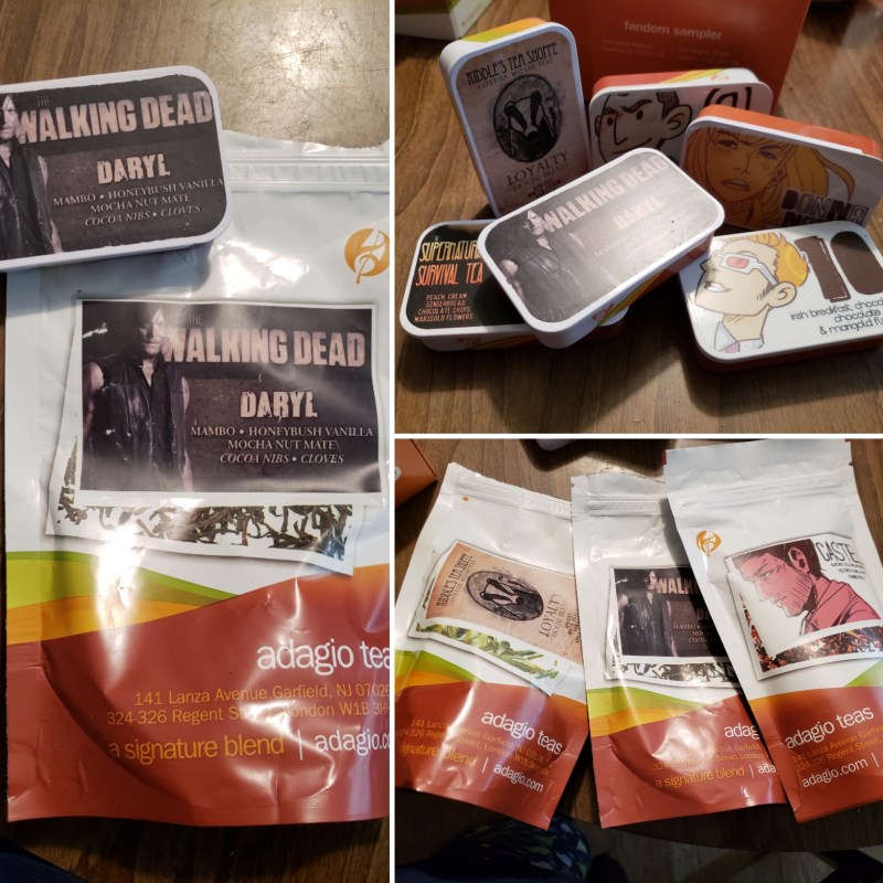 Fandom Sample from Adagio Teas. Represented are Harry Potter, The Walking Dead, Doctor Who, Supernatural, and The Avengers: Civil War.