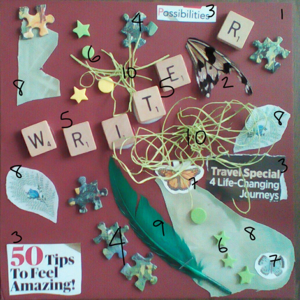 3. I glanced at the pile (very large pile) of magazines and newspapers taking up a third of the table. The word travel caught my eye, and that was all I was going to take, but then the subtitle, 4 Life-Changing Journeys drew my eye. I was going to take travel and journeys, but then the whole phrase – 4 life-changing journeys – really grabbed me, not only as something I’ve been feeling this year and last, but also as a fantastic writing prompt to use in future days. What four life-changing journeys have I been on in recent years? What a perfect way to organize some thoughts, and so I took the whole thing. I tore the small rectangle out and put the magazine back in the pile. Before I could move off, I noticed another article about 50 tips to feel amazing. It had to do with getting healthy and avoiding chronic illnesses such as diabetes and high blood pressure, but it was the 50 that took me by the hand. I will be turning fifty at the end of the year, and one of my goals is to write weekly reflections. I’ve been somewhat neglectful, but the number, bold and in red, needed to come. I tore off the whole cover and thought to look at it more closely. It wasn’t until I was back at my seat that I noticed the tagline of the magazine: Real Possibilities. I cut out possibilities and I had all the words I thought I would need.